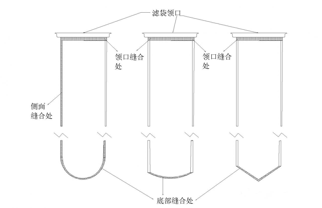 按尺寸不同滤袋通常有四个规格,分别为1号、2号、3号和4号滤袋,使用广泛的为2号滤袋,直径约180mm,长度810mm,过滤面积约0.5m2,大水通量约为40m3/h。按材质常见的滤袋有聚丙烯、聚酯、尼龙、PTFE四类。滤袋由滤材和袋口固定用的领环组成,滤材和领环之间通过线缝或热熔方式进行缝合,领环有金属和非金属两类。滤材裁剪为圆柱形,底部为弧形或平底或三角锥型的。垂直侧边以及底部的缝合有线缝和热熔两类,典型滤袋结构示意见下图。